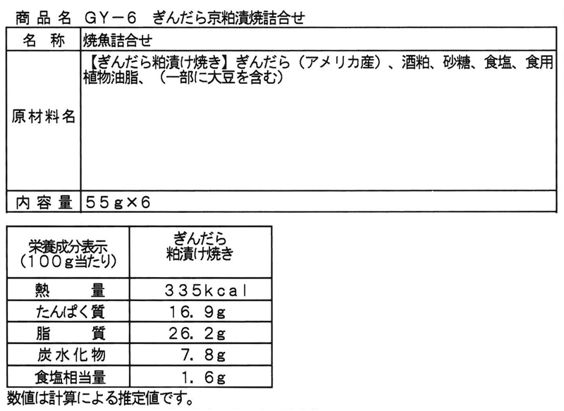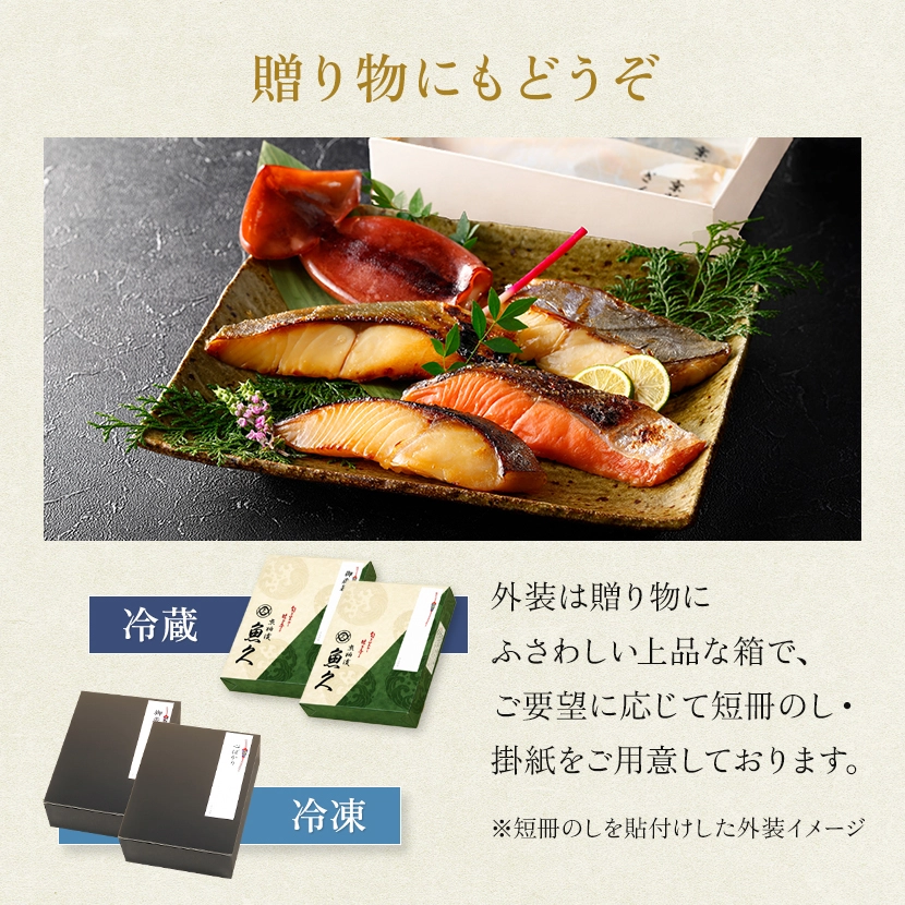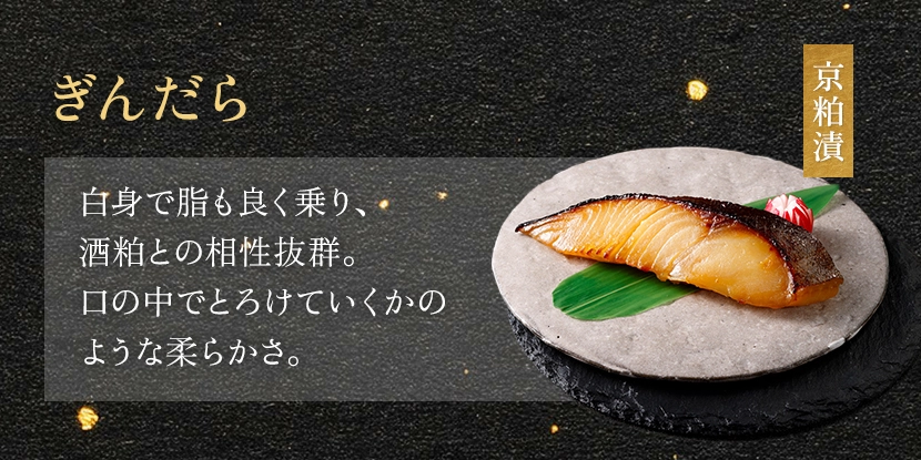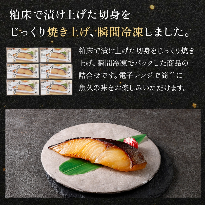 粕床で漬け上げた切身をじっくり焼き上げ、瞬間冷凍でパックした商品の詰合せです。